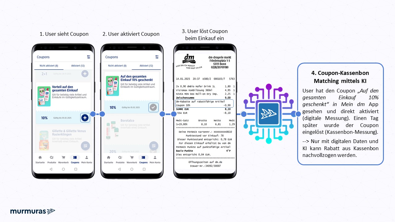 Doch wie misst man den Erfolg personalisierter Coupons überhaupt? Neben der Aktivierung in der App ist vor allem die tatsächliche Einlösung im Store entscheidend. Um diese zu erfassen, hat Murmuras rund 3.000 digital getrackte Proband:innen zusätzlich gebeten, ihre Papierkassenbons zu scannen.
