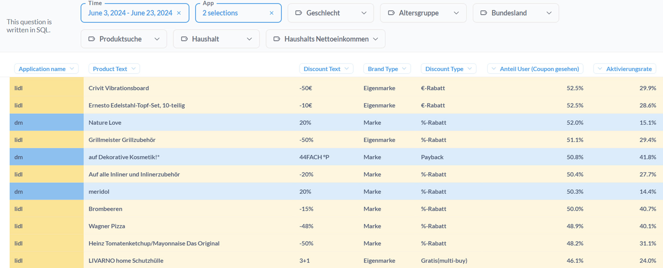 Im nachfolgenden Beispiel wurde für getrackte Coupons die User-Reichweite (Anteil gesehen) und Aktivierungsrate mitgegeben. Anhand der Reichweite kann der Personalisierungsgrad abgeleitet werden. Je weniger User einen Coupon erhalten/sehen, desto höher der Personalisierungsgrad.